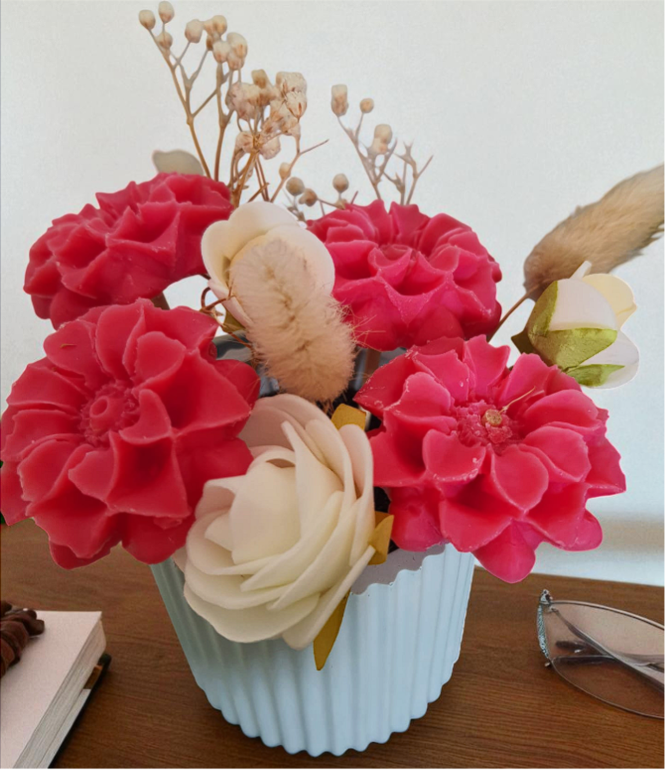 Nos bouquets sont fabriqués à la main, à Clermont-Ferrand. Ils sont réalisés avec des cires végétale d’olive. Parfumés avec des fragrances de Grasse, sans CMR*. Tous nos bouquets peuvent être personnalisés, couleurdes fleurs, ainsi que la fragrance.