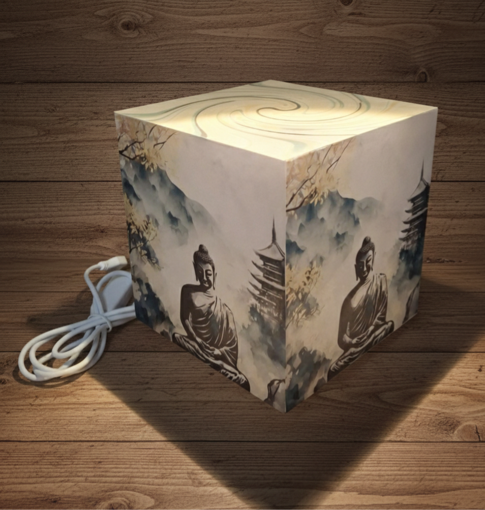 Lampe réalisée en cire, base en bois, éclairage Led, interrupteur marche/arrêt, prise USB A, adaptateur non fourni.