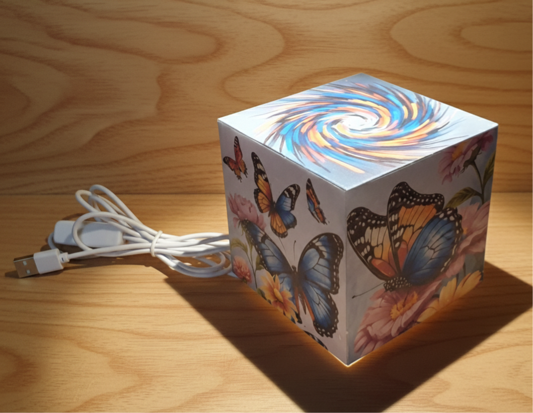 Lampe réalisée en cire, base en bois, éclairage Led, interrupteur marche/arrêt, prise USB A, adaptateur non fourni.
